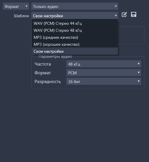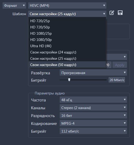 - Изменены шаблоны вывода HEVC, QuickTime, Transport Stream, AVI, Только аудио (удалены шаблоны низкого разрешения, добавлены шаблоны 50/60 кадров в секунду, в своих настройках удалены не рабочие параметры, у некоторых параметров расширен диапазон настроек)