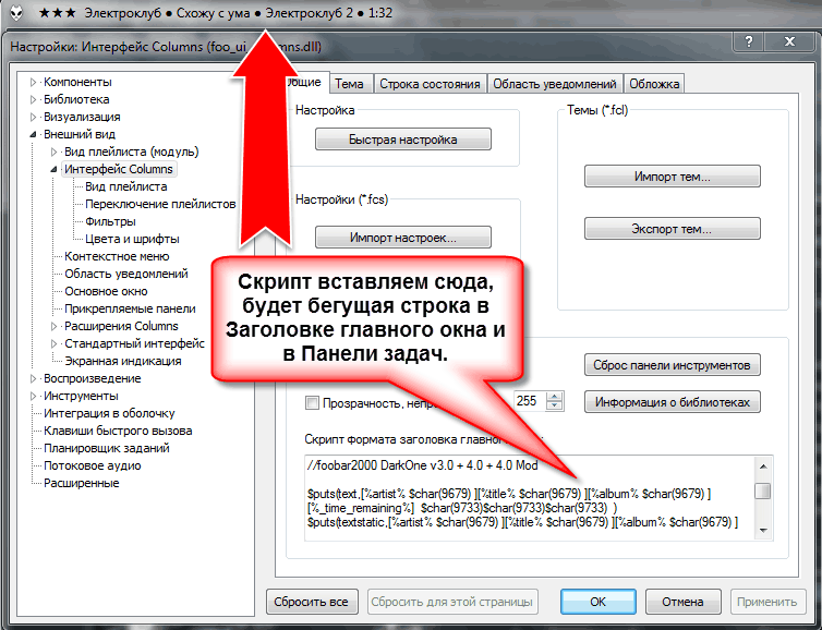 Для создания бегущей строки с информацией в Заголовке главного окна и Панели задач, открываем окно и вставляем необходимый скрипт: