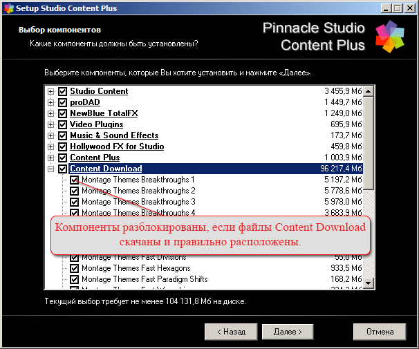 Content Download V2 - это дополнения для сборки Pinnacle Studio & Content Plus. Особенность этих дополнений в том, что они не входят в инсталлятор Content Plus, но устанавливаются с его помощью. Дополнения скачиваются отдельно и размещаются в папке "Content Download", после этого пункты компонентов Content Download будут разблокированы.