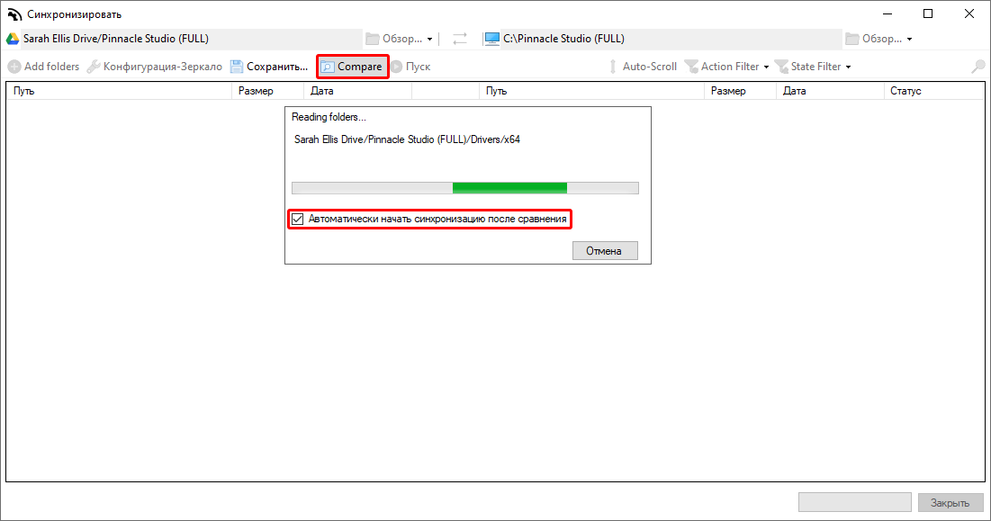 Запускаете синхронизацию и нажимаете кнопку «Compare». Установите галочку на «Автоматически начать синхронизацию после сравнения».