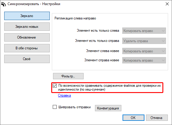 Google Диск должен быть открыть слева, а папка на компьютере справа. Нажимаете меню «Синхронизация -> Текущие папки». В настройках «Зеркало» устанавливаете галочку на «По возможности сравнивать содержимое файлов для проверки их идентичности (по хеш-суммам)».